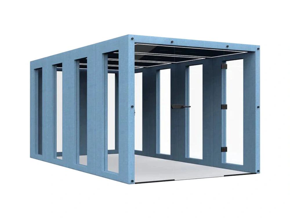 Meet Bob 2-Person Meeting Pod with Glass Front and Back. The Bob collection with glass doors offers comfort and greater privacy. The design, based on mobile devices utilises large flat panels and soft rounded corners which not only look great but reduce and absorb sound.