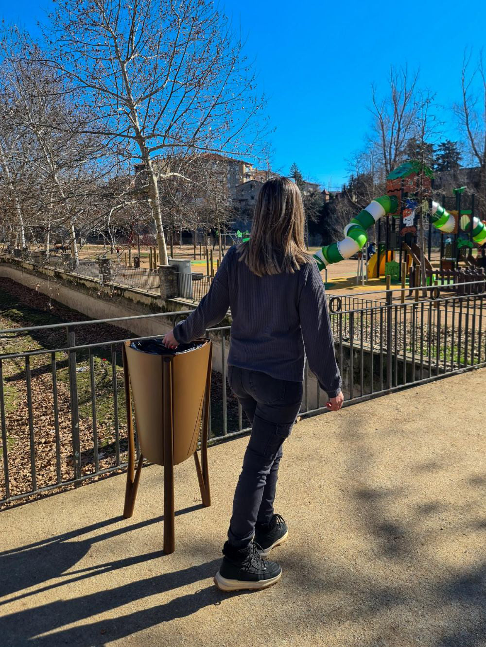 A zinc-plated steel structure and interior bin of the Minsk Outdoor Waste Bin are secured by a hinged ring. Standing atop oven-painted ductile iron feet with a twofold anti-corrosion technique, it is finished in marson with epoxy and polyester powder coatings. Easy floor installation in a range of outdoor environments is ensured by the triangular anchoring base's holes for M8 screws (not included).