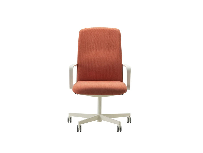 The executive chair Temps has a striking feature in its height-adjustable base made in die-cast aluminium, pure and elegant. This chair guarantees excellent ergonomics and comfort thanks to its weight-activated, synchro-tilt mechanism that is able to regulate the degree of tilting autonomously according to the users body weight. Its anatomical shape encourages good posture. An injection-moulded polypropylene shell fits around the seat and contains the mechanism hugging the users lower back.